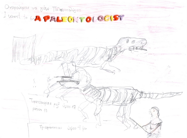 This is the picture that George Xenikakis, a truly special A’ Junior student, drew to depict his dream job which, admittedly, is not so common! What we did next was to visit the well-known website www.thedreammosaic.org and upload the drawing there in order for it to form part of the wider collection of children’s dreams worldwide. In this drawing, George is picturing himself as a paleontologist who measures the bones of some recently excavated dinosaurs. In case you are interested in finding out where George’s picture stands in the global dream mosaic, you can visit the site and then click on Europe, Greece.