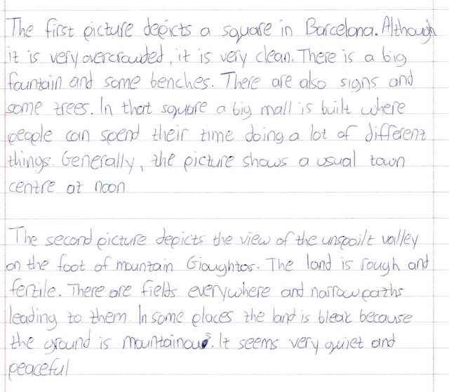 This is a simple writing activity that followed the blog activity the FCE group did a few weeks ago to enhance their writing and speaking skills concerning the description of various places which commonly forms a Cambridge exam topic. Here are Michael Christodoulakis‘ paragraphs about two of the pictures included in the blog post that was under discussion in class. The reason for posting this assignment is to show to the present and future FCE students how a learner’s use of language can evolve and vividly communicate all kinds of messages, simply by employing a pleasantly different array of words and structures.