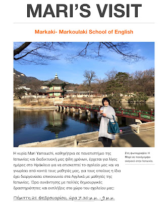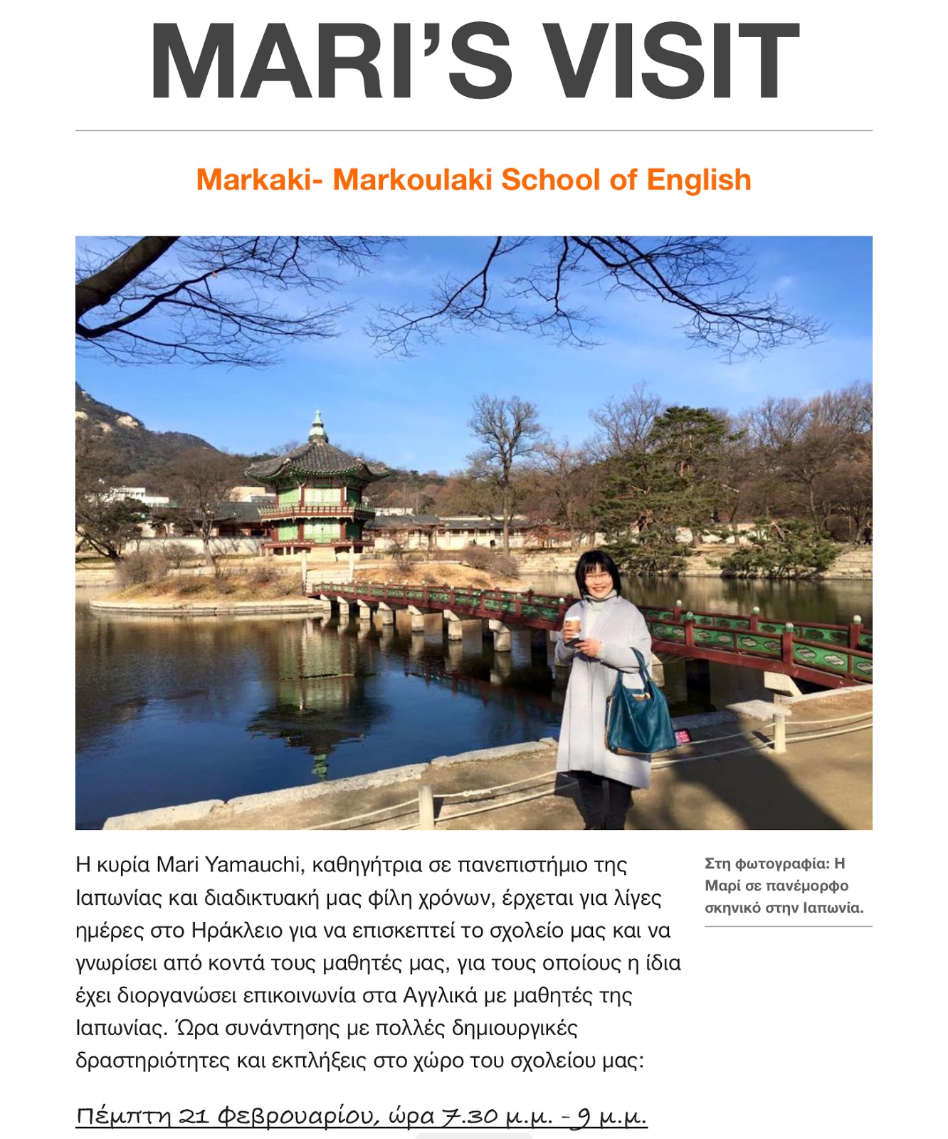 08 February 2019, by Christina Markoulaki In english-post Our wonderful colleague, Mari Yamauchi, is going to visit our school very soon, with an amazing educational event about to take place. A unique learning experience for our students! Tags E-pals projectEvents